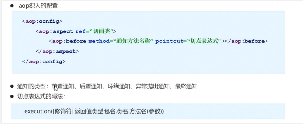 表达式: 访问修饰符 返回值 包名.包名.包名...类名.方法名(参数列表) 标准的表达式写法: public void com.itheima.service.impl.AccountServiceImpl.saveAccount() 访问修饰符可以省略 void com.itheima.service.impl.AccountServiceImpl.saveAccount() 返回值可以使用通配符,表示任意返回值 * com.itheima.service.impl.AccountServiceImpl.saveAccount() 包名可以使用通配符,表示任意包。但是有几级包,就需要写几个*. * *.*.*.*.AccountServiceImpl.saveAccount()) 包名可以使用..表示当前包及其子包 * *..AccountServiceImpl.saveAccount() 类名和方法名都可以使用*来实现通配 * *..*.*() 参数列表: 可以直接写数据类型: 基本类型直接写名称 int 引用类型写包名.类名的方式 java.lang.String 可以使用通配符表示任意类型,但是必须有参数 可以使用..表示有无参数均可,有参数可以是任意类型 全通配写法: * *..*.*(..)